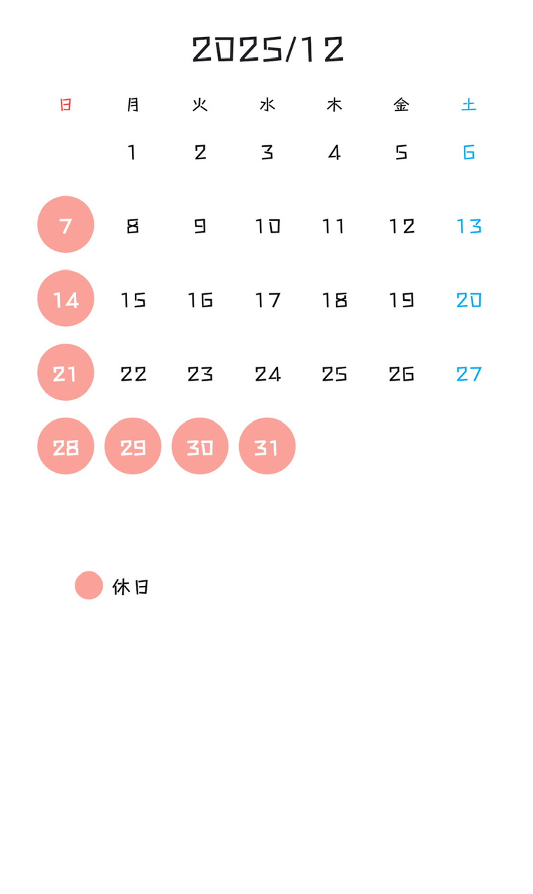 2025年/12月の営業カレンダー